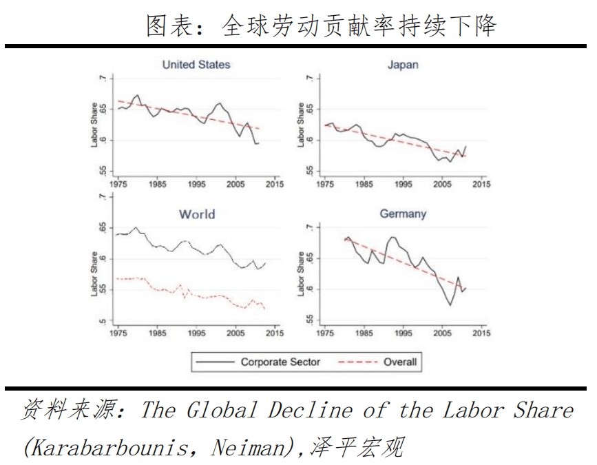 大缓和时代,劳动力人口增加,劳动参与率提高,叠加科学技术发展、生产所需人力减少,从供给侧对劳动收入有压制作用;工会权利减弱、以及岗位的同质性,降低了工人薪资议价能力;全球化带来的人员自由流动,企业离岸化或通过外包填补职位空缺,降低了工人工资期望;全球多数经济体的技术进步,更多地提高了资本的边际生产率(资本偏向型)。 形成了80年代以来的“劳动的话语权减弱、资本的话语权增强”。1980年以来世界上大部分国家的劳动所得份额都在下降,1980-2011年,世界范围内劳动所得份额从64%下降到了59%,且仍然呈现持续下降趋势。(L Karabarbounis,B Neiman,The Global Decline of the Labor Share,Nber Working Papers,2013)。