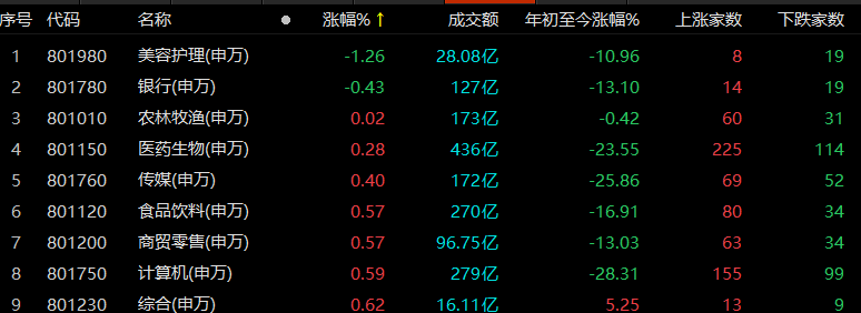 大消费板块低迷。美容护理今日领跌全场,爱美客收跌1.79%报526元/股,贝泰妮收跌4.57%报174.1元/股;银行板块微跌,农林牧渔、医药生物、传媒、食品饮料、商贸零售涨幅均不超过1%。