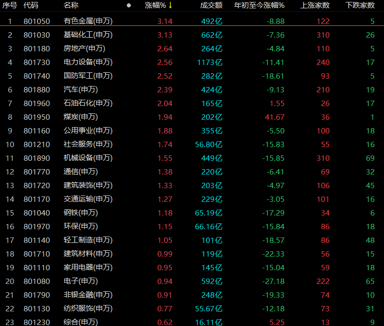 新旧能源板块大涨。有色金属、基础化工涨幅超过3%,石油石化、煤炭、公用事业涨约2%;房地产、建筑装饰也表现不错;军工、电力设备、汽车涨幅也超过2%。值得注意的是,宁德时代盘中跌逾5%,最后收跌2.81%报455.2元/股。