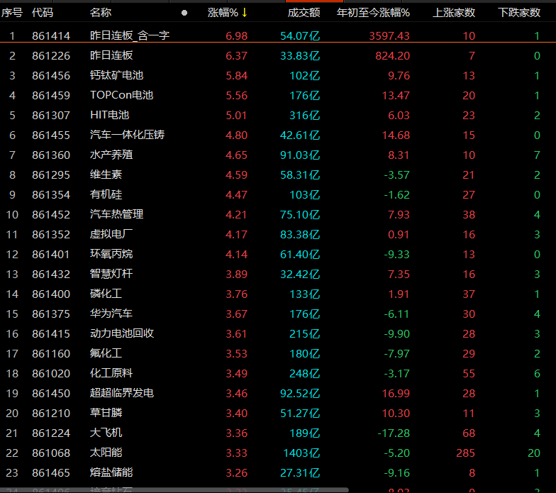 新能源、汽车等相关概念股大涨,钙钛矿电池、HIT电池、汽车一体化压铸板块、汽车热管理、华为汽车等板块领涨;化工原料、草甘膦等能源概念也表现亮眼;太阳能、熔盐储能、新能源概念板块涨幅均超过3%。