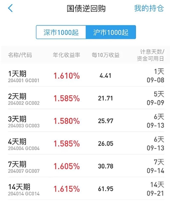 操作方法如下:9月7日卖出1天期逆回购,收获1天利息,资金在9月8日盘前已处于可用状态。9月8日再卖出1天期逆回购,收获4天利息,资金在9月9日盘前已处于可用状态。需要提醒的是,如果是9月9日,也就是休假前一天再做逆回购,只能计算一天的利息,放假期间不计算利息。