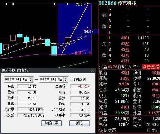 9月7日,热门股传艺科技再度涨停,截至收盘,报43.81元,连续5个交易日涨停,期间累计涨达61.01%。