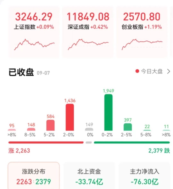 9月7日,A股三大指数全线飘红,截至收盘,上证指数涨0.09%报3246.29点,深证成指涨0.42%报11849.08点,创业板指涨1.19%报2570.8点;两市合计成交8719亿元,北向资金净卖出33.74亿元。总体来看,A股个股跌多涨少。