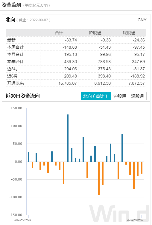 9月7日,北上资金净卖出33.74亿元,连续5天净卖出,本月累计净卖出195.13亿元。从近期北上资金变动趋势来看,由于欧美股市的连续下跌打压市场信心,外资亦采取避险举措,持续净卖出。
