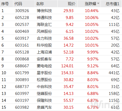 从涨幅居前的汽车与汽车零部件板块来看,博俊科技、神通科技、海联金汇、风神股份、合力科技、科华控股(维权)、上海沿浦、安凯客车等个股涨停或涨幅超10%,菱电电控、星宇股份、松原股份、中自科技、继峰股份、保隆科技、泉峰汽车等多股亦大幅拉升。