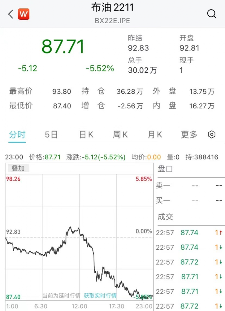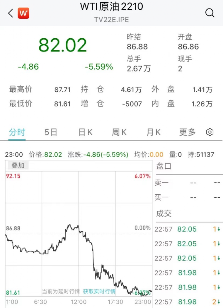 市场担心经济衰退和需求不振,油价大跳水,跌至八个月新低。WTI 10月期货收跌4.94美元,跌幅5.68%,报81.94美元/桶,截至目前,跌幅收窄。布伦特11月期货收跌4.83美元,跌幅5.20%,报88.00美元/桶。截至目前,跌幅加深。
