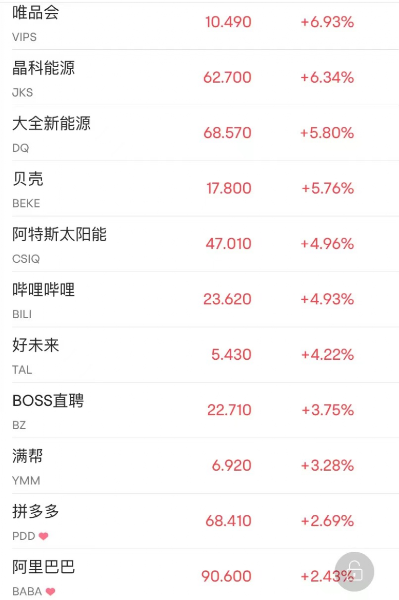 热门中概股多数收涨,爱奇艺涨12.83%,B站涨近5%,好未来涨4.22%,拼多多涨2.69%,阿里巴巴涨2.43%,蔚来涨2.16%,百度涨1.74%,腾讯音乐涨1.71%,京东涨0.89%,理想汽车涨0.83%,小鹏汽车涨0.63%。
