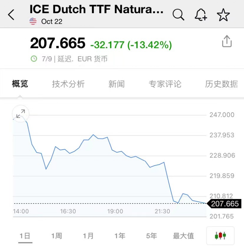 欧美天然气两日连跌。欧洲基准TTF荷兰天然气10月期货尾盘跌近11%至214欧元/兆瓦时,盘中最深跌近15%并下逼200欧元整数位,接近一个月新低。目前位于207.665欧元/兆瓦时附近。