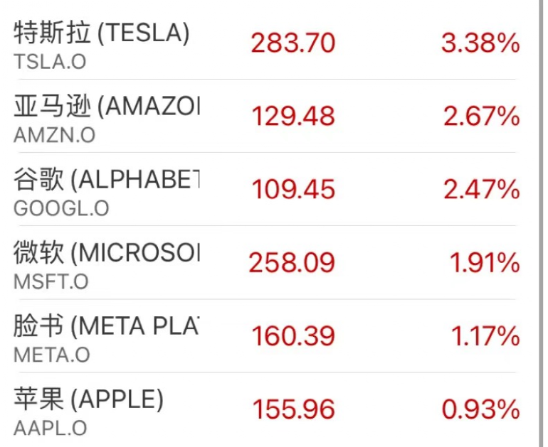 大型科技股集体走高,苹果涨0.93%,微软涨1.91%,谷歌涨2.79%,亚马逊涨2.67%,Meta涨1.17%,特斯拉涨3.38%。