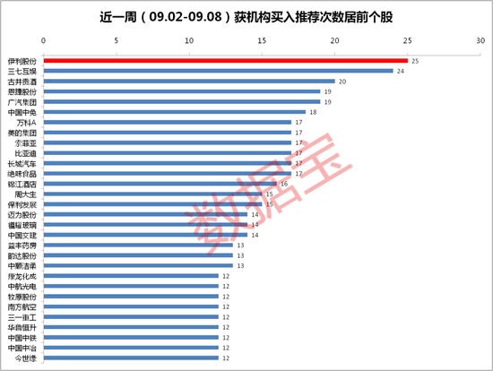 细分至个股,共计50股获10次及以上机构评级。其中,伊利股份以25次评级居于首位。三七互娱、古井贡酒个股评级数量亦不小于20家。