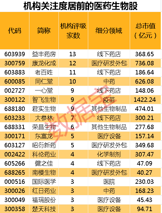 分行业来看,医药生物、电力设备、电子行业近期最受机构关注,机构评级个股数量均超过90家,其中医药生物行业达到了103家。医药生物细分领域中机构最看好线下药店板块,益丰药房、老百姓、一心堂均获9家以上的机构关注。