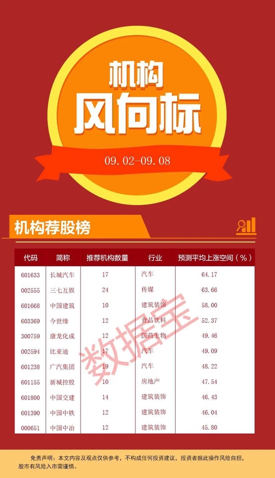数据宝统计,在获10次及以上机构评级的50股中,11股机构一致预测上涨空间超过40%,其中长城汽车、三七互娱预测上涨空间超过60%。
