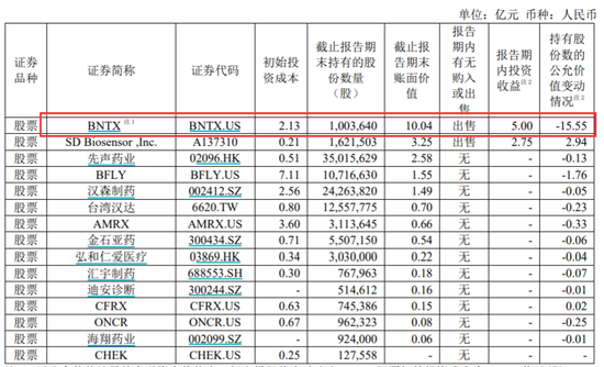 今年上半年,复星医药持有包括美股、港股以及A股等在内的10余家上市公司股份,其中,第一大重仓股为美股的医药巨头BNTX(BioNTech)。截至今年上半年末,公司持仓BNTX的市值为10.04亿元,为第一大重仓股。但作为复星医药权重最高的公司,却带来了最大的亏损。