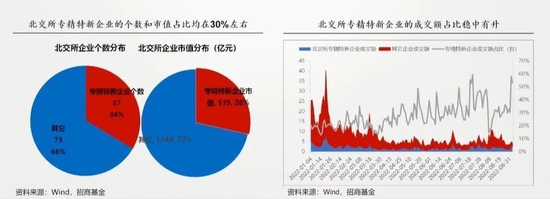 大家可以看到,37家北交所上市的“专精特新”企业中无论是平均市值、估值水平还是净利润增速均高于北交所上市企业平均水平。北交所上市的专精特新企业现在占比占了三成,成交额稳步提升。现在北交所专精特新企业的成交额从年初的20%提升到30%,北交所打造服务创新型中小企业的主阵地已获得初步成效。