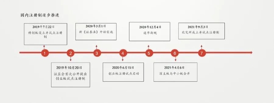 国内注册制的发展进程从2019年7月科创板设立到2019年10月证监会首次公开提出创业板的试点注册制、2020年新证券法的实施、2020年6月创业板试点的推动以及2020年12月退市新规的颁发,再到2021年深交所和中小主板的合并,以及2021年9月3号北交所成立并试点注册制,这是整个发展脉络。