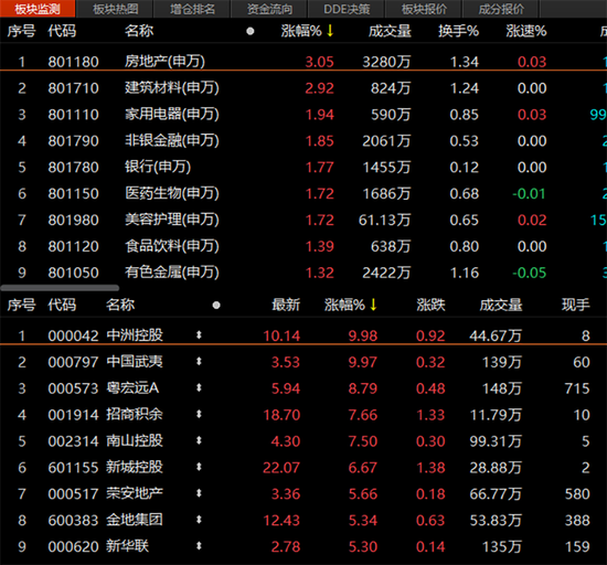 此外,地产股全线爆发,中洲控股、中国武夷等涨停;保利发展大涨5%,万科A涨近4%;此前五连板的粤宏远A早盘再涨8%。