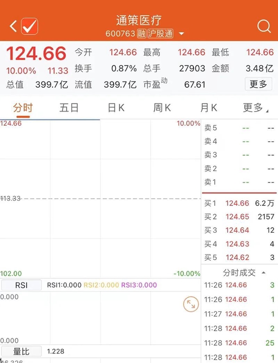 “牙茅”通策医疗今日早盘开盘便一字涨停,报124.66元/股,半日成交3.48亿元。
