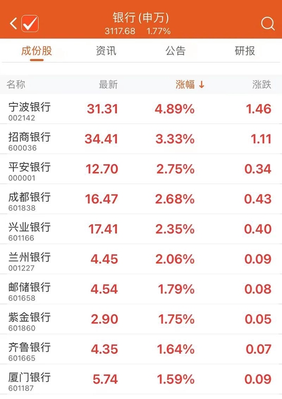 银行板块中,宁波银行涨近5%,招商银行、平安银行等纷纷跟涨。