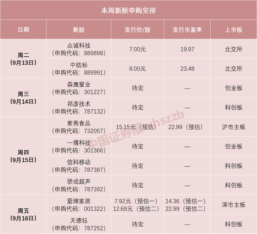 据目前安排,若无变化(9月13日到16日)共有10家新股申购,包括上证主板1家,深证主板1家,科创板4家,创业板2家,北证2家。