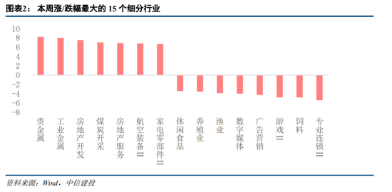 本周市场普遍上涨,上证指数上涨2.37%,深证成指上涨1.5%,创业板指小幅上涨0.6%。在上周的策略周报中,我们指出部分具旺季预期的估值低位板块或有望迎来阶段性轮动性机会。本周的行业分化情况呈现了这一特点:房地产、煤炭、有色金属表现最好,分别上涨7.51%、6.63%和6.02%,传媒、农林牧渔、计算机表现最差,分别下跌3.80%、3.31%和0.57%。从市场风格来看,国证价值指数上涨3.28%,国证成长指数上涨2.07%,大盘指数上涨1.75%,小盘指数上涨1.80%,风格回摆特征较为明显。近期市场特征反映了A股开始修复悲观预期。
