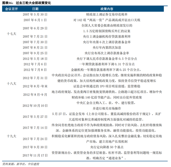 大会前政策预期上行。复盘过去三轮大会前政策变化看,当经济较差且前期稳增长措施发力效果不显著时,大会前1-2个月政策会更为密集出台,带动经济快速企稳。在当前经济基本面复苏态势疲弱背景下,大会的召开将调高政策预期,提振市场风险偏好。