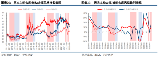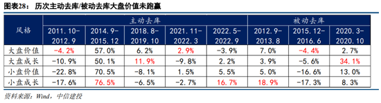 从历次主动去库/被动去库周期表现看,大盘价值跑赢概率并不大,业绩也缺乏弹性。复盘2011年以来主动去库/被动去库周期,大盘价值仅在2011.10-2012.9、2021.11-2022.3的熊市阶段因防御价值跑赢,以及2015.12-2016.6的被动去库阶段因供改催化跑赢,其余5轮阶段中成长均相对占优(包括大盘成长或小盘成长)。此外,历轮主动去库/被动去库阶段,大盘价值业绩表现较大盘成长也并未占优,且缺乏向上弹性。
