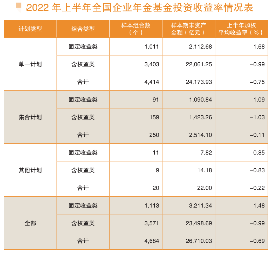 截至二季度末,企业年金基金单一计划资产金额2.42万亿,占据了基金绝大部分资产。单一计划整体上半年加权平均收益率为-0.75%,其中固收类组合收益率为1.68%,含权益类组合收益率-0.99%。