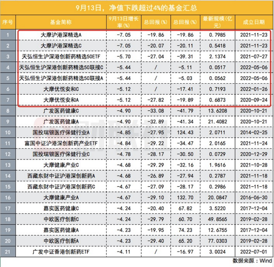 不出意外,CRO个股大跌之下,重仓基金难以全身而退。截至9月13日,更新净值表现的基金中,医药主题基金扎堆在亏损前列。21只医药主题基金亏损超过4%,7只亏损超过5%。