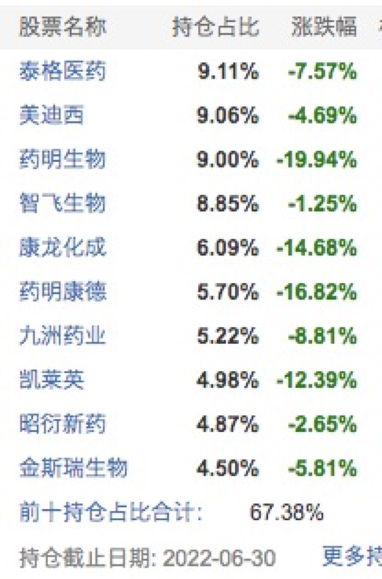 从前十大持仓来看,葛兰的中欧医疗健康混合的前十大重仓股的确“中招”个股颇多,康龙化成跌幅13.95%、药明康德和凯莱英跌停,九洲药业、泰格医药跌幅也超过7%。不过医药行业涨幅最大的通策医疗也在其前十大重仓股中。