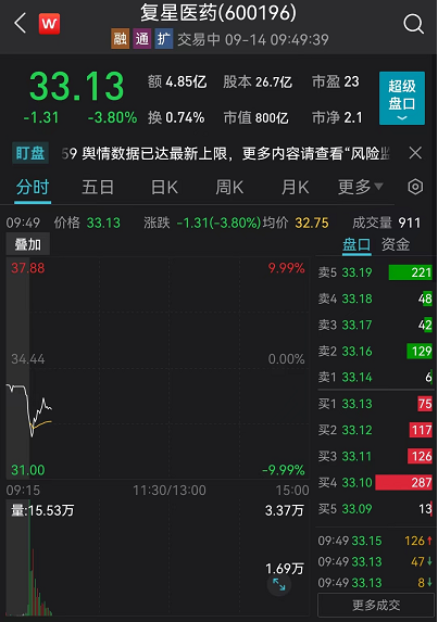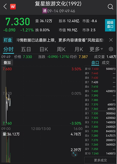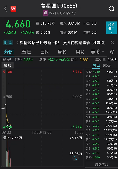 9月14日上午,复星系上市公司出现普跌,复星国际跌近5%,复星医药跌近4%,复星旅游文化跌超1%。