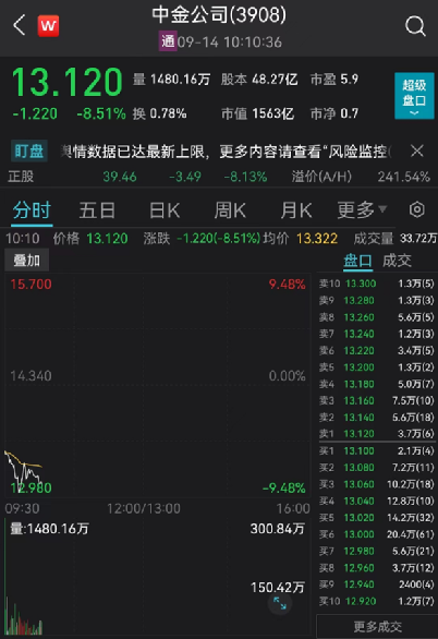 9月14日,中金公司A股低开跌9.8%,H股低开5.58%。截至发稿,中金公司A股、H股跌幅均超8%。