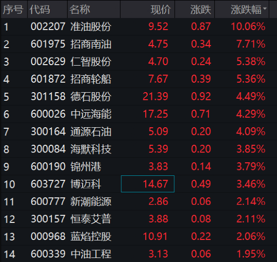 9月14日,能源板块逆市走高,给市场带来一抹亮色。准油股份早间开盘不久后即触及涨停,招商南油、仁智股份(维权)、招商轮船等涨超5%,德石股份、中远海能、通源石油等涨幅居前。