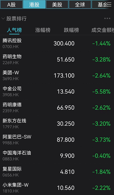 科技龙头全线下跌,阿里巴巴跌近4%,美团、腾讯、小米纷纷下挫。昨天官宣270亿配股计划的中金公司港股出现大跌,开盘跌超5%。