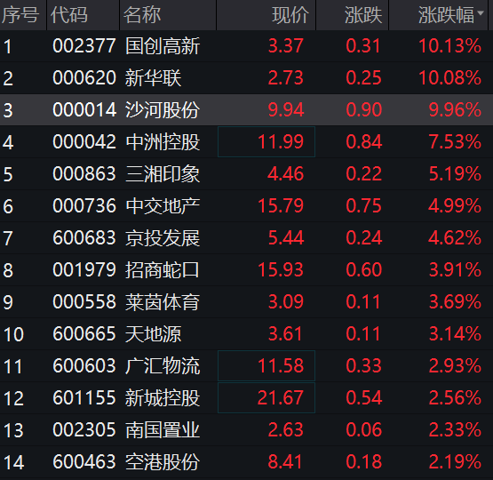 9月14日上午,房地产板块早盘震荡拉升,国创高新、新华联、沙河股份快速涨停,中洲控股、三湘印象涨超5%,中交地产、中投发展涨幅居前。