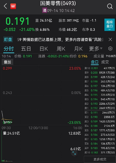 9月14日,港股国美零售早盘下挫,截至发稿,国美零售跌21.4%,报0.191港元,成交额4.25亿港元。
