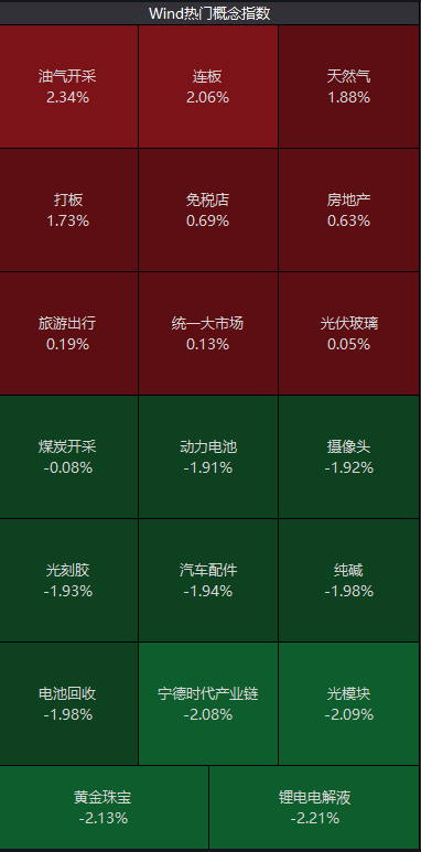 截至发稿,飘红个股已超千只,但仍有3700+个股飘绿。油气开采、天然气、房地产、国防军工等板块有所回暖,锂电、黄金珠宝、动力电池等板块仍走低。