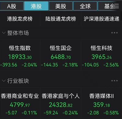 港股方面,恒生指数低开2.04%,再度失守19000点,恒生科技指数跌2.56%,恒生国企指数跌2.18%。