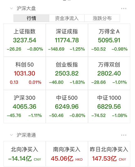 截止收盘,沪指跌0.8%,深成指跌1.25%,创业板指跌1.84%。两市共1167只个股上涨,仅3424只个股下跌