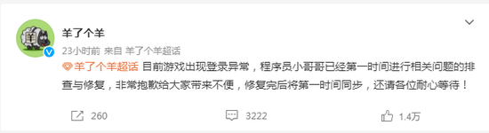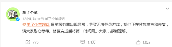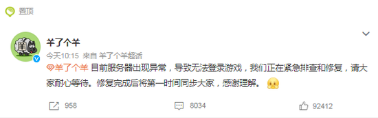 由于该游戏太火爆,其服务器也出现异常现象。甚至有网友反映游戏不到24小时崩了3次。对此,游戏官方微博表示,目前服务器出现异常,导致无法登录游戏,公司正在紧急排查和修复,请大家耐心等待。修复完成后将第一时间同步大家,感谢理解。