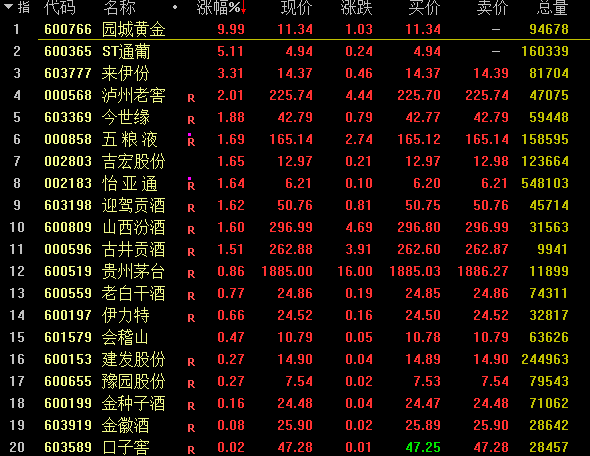 今日早盘,白酒股纷纷走强,板块指数逆势上涨超1%,ST通葡涨停,并创近半年新高;龙头五粮液盘中上涨超2%,贵州茅台亦涨超1%,泸州老窖、今世缘、来伊份等也纷纷逆势走强。