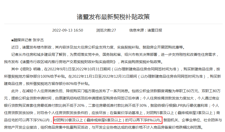 浙江省诸暨市政府网站消息,为进一步支持刚性和改善性住房需求,发布《诸暨市行政区域内推行房地产交易契税财政补贴实施细则》。