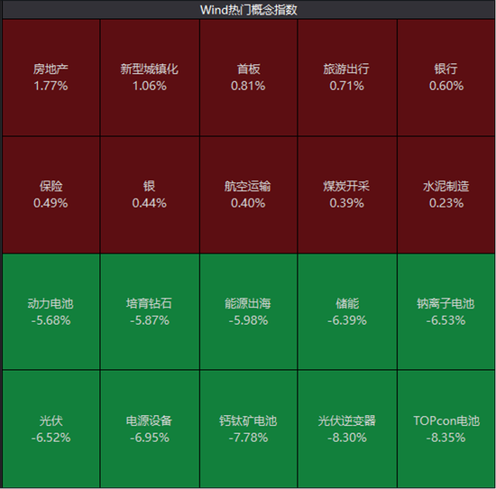 今日三大指数高开低走,沪指失守3200点关口,创业板指午后一度跌近4%,赛道股掀跌停潮。风光储等新能源板块均大幅下挫,房地产产业链走强,跨境支付、银行、保险等较为活跃。TOPCon电池、金刚线、钠离子电池等板块跌幅居前。