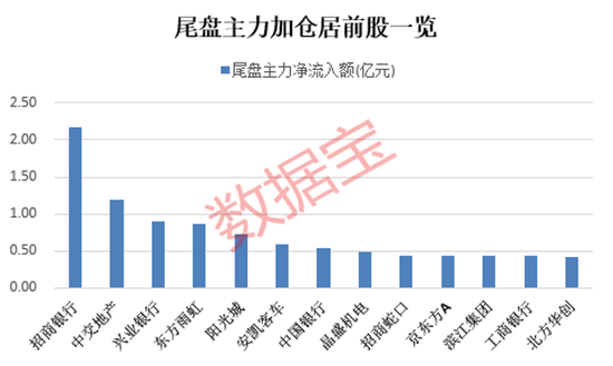 具体到个股,招商银行、中交地产尾盘主力净买入额居前,是A股中唯二获得尾盘主力超亿元净流入的个股,分别净流入2.18亿元和1.19亿元。
