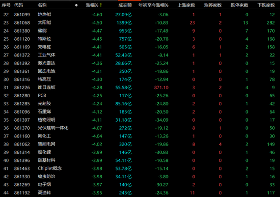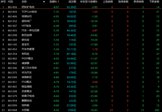 钙钛矿电池、TOPCon电池、HIT电池领跌,汽车一体化压铸、胎压监测、汽车热管理、减速器、华为汽车、特斯拉、充电桩等汽车概念跌幅均超过4%,地热能、太阳能、储能、光伏建筑一体化概念也遭到资金减持,第三代半导体、Chiplet概念、中芯概念大跌。