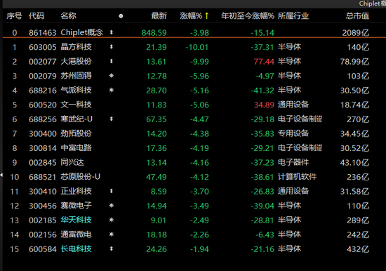 Chiplet概念跌约4%,15只相关个股全部飘绿,晶方科技、大港股份跌停,苏州固锝跌约6%,长电科技、华天科技跌近2%,寒武纪-U、芯原股份均跌逾4%。