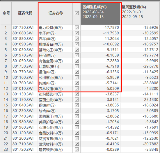 “海外需求担忧和地缘政治扰动下,市场下挫、热门赛道大幅调整。”华安证券策略联席首席分析师刘超向《国际金融报》记者分析,今日市场大幅下挫,成长风格明显调整,主要原因包括:第一,电动汽车产业链海外需求出现回落担忧和预期。起源于美国IRA法案签署,总统拜登表示从2024年开始,电池成分中包含任何产自“特别关注国”名单中的国家(中国在列),将不再适用电动车补贴方案。同时,9月14日美国官方文件也透露了一项美国交通部的动议,拟要求接受联邦政府资助的电动汽车充电设备2023年起必须在美国制造。IRA法案和交通部电动汽车制造业简报直接影响到中国电动汽车出海需求和全球份额,引发市场对新能源链条未来能否持续高增长的担忧,导致热门赛道领跌。第二,美参议院外交委员会批准推进《台湾政策法案》,再次扰动台海局势,中美关系紧张。如果该法案通过将全面改变美国与台湾的关系,包括军事上针对台湾提供45亿美元安全援助、将台湾列为美国“主要非北约盟友”,外交上将台湾驻华盛顿经济文化代表处更名为“台湾代表处”,支持台湾参加国际组织和多边贸易框架等,将严重破坏“九二共识”的一个中国原则,台海局势、中美关系都将再起波澜。第三,欧盟委员会一项立法提案禁止销售和提供使用强迫劳动生产的产品。这有可能影响到国内产品对欧盟的出口等。