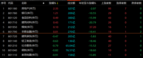 房地产板块逆市涨逾2%,我爱我家等7只个股涨停;银行、食品饮料等也抬头护盘,煤炭、非银金融表现相对抗跌。招商银行涨幅超过3%,贵州茅台上涨0.59%报1880元/股,五粮液、山西汾酒、泸州老窖涨幅均超过1%,海螺水泥逆市涨逾2%。