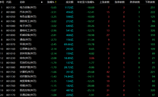 电力设备大跌5.65%,251只相关个股收跌,跌停股9只。大盘股跌幅较大,宁德时代收跌4.59%报414.35元/股,隆基绿能、亿纬锂能跌幅超过7%。
