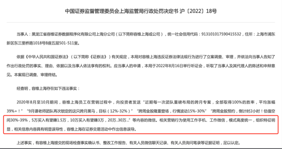 上海证监局9月8日披露的一起违法案件显示,黑龙江省容维证券数据程序化有限公司上海分公司(简称“容维上海”)在营销过程中存在明显的误导性宣传。细看这些营销话术,该公司在开展业务的过程中,颇具“忽悠式荐股”的特征。