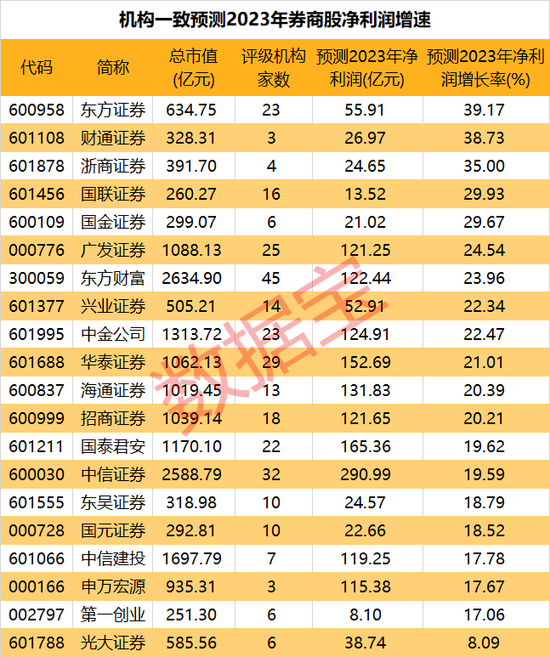 数据宝统计,根据3家及以上机构一致预测,12只券商股明年净利润增速有望突破20%。中信证券全年利润或将逼近300亿元大关,龙头地位进一步凸显;东方证券、财通证券、浙商证券全年有望实现同比35%以上增长。